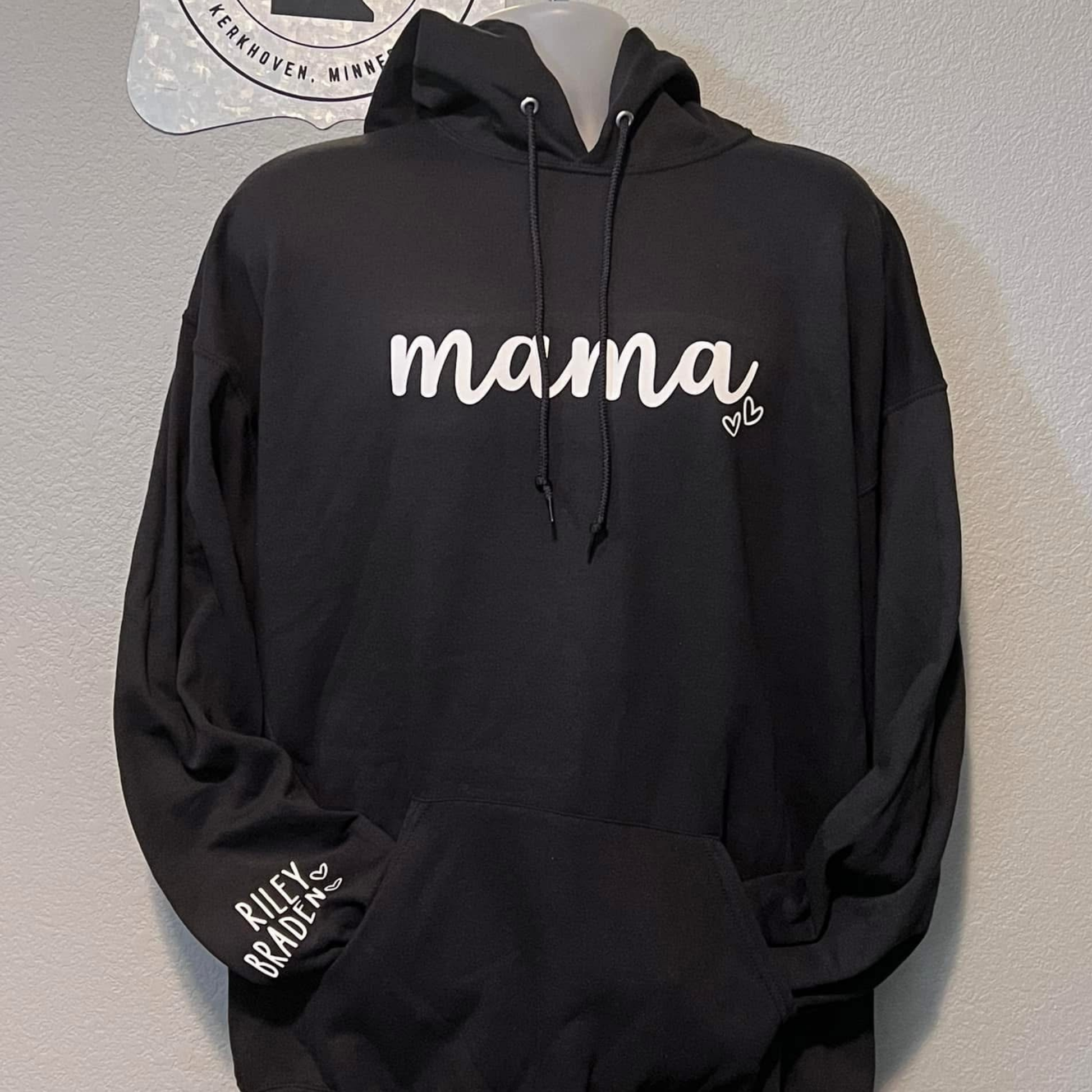 Design will be black or white depending on apparel color. Customize names on sleeve. Hearts on the main design will be dependant on how many names their are. Mama can be switched out with any name. Add apparel color and names to the customize box or email me at Lakesandprairiedesigns@gmail.com