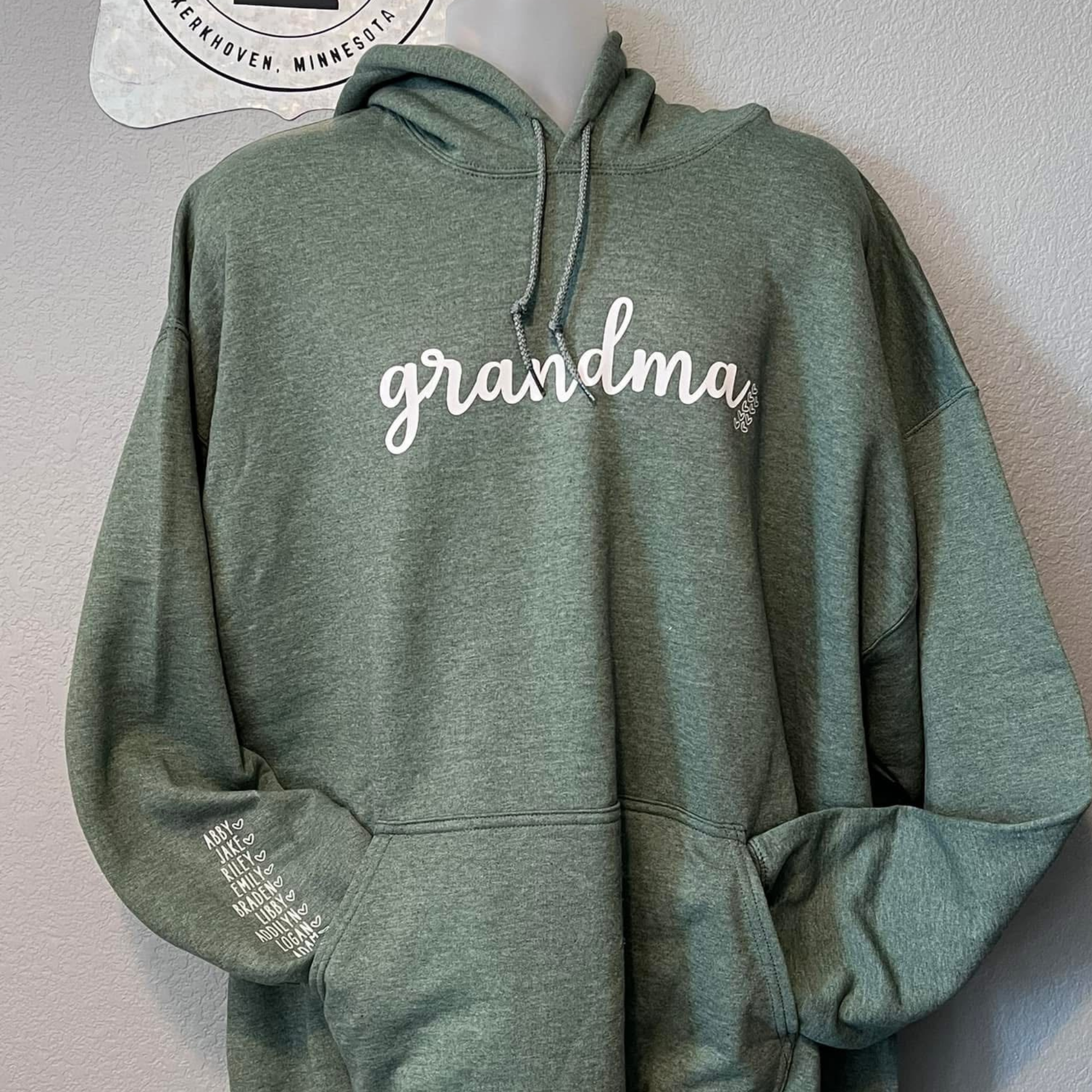 Any name where grandma is, along with as many hearts as grandkids. Add grandkid's names on sleeve(s) and as many as you need. Design will be black or white depending on apparel color chosen.